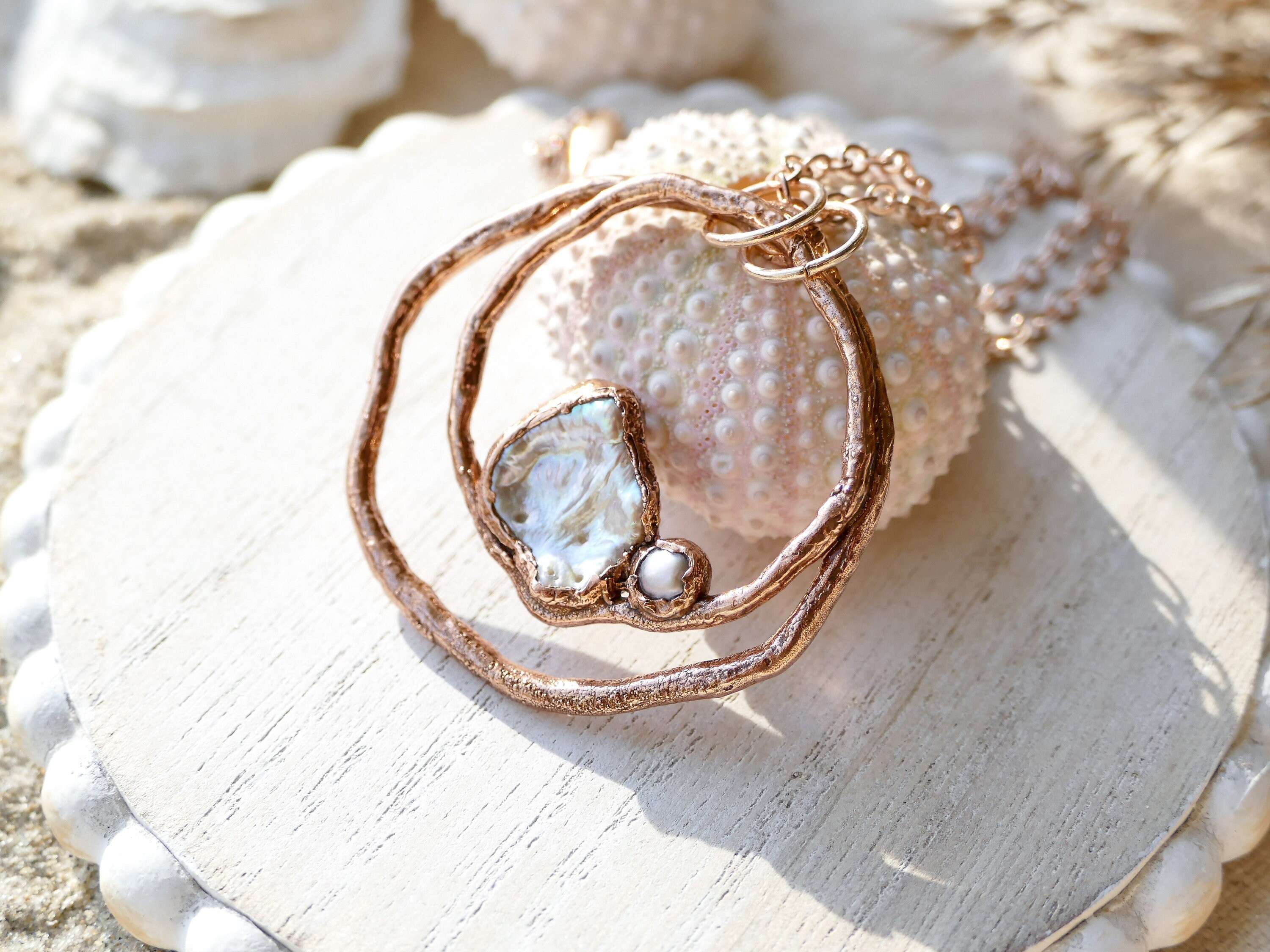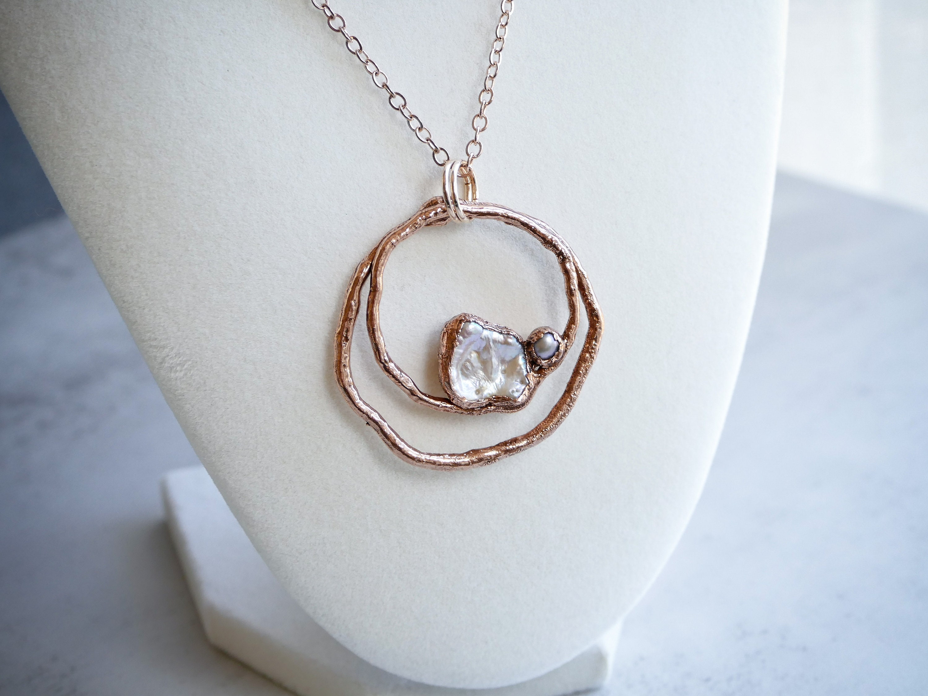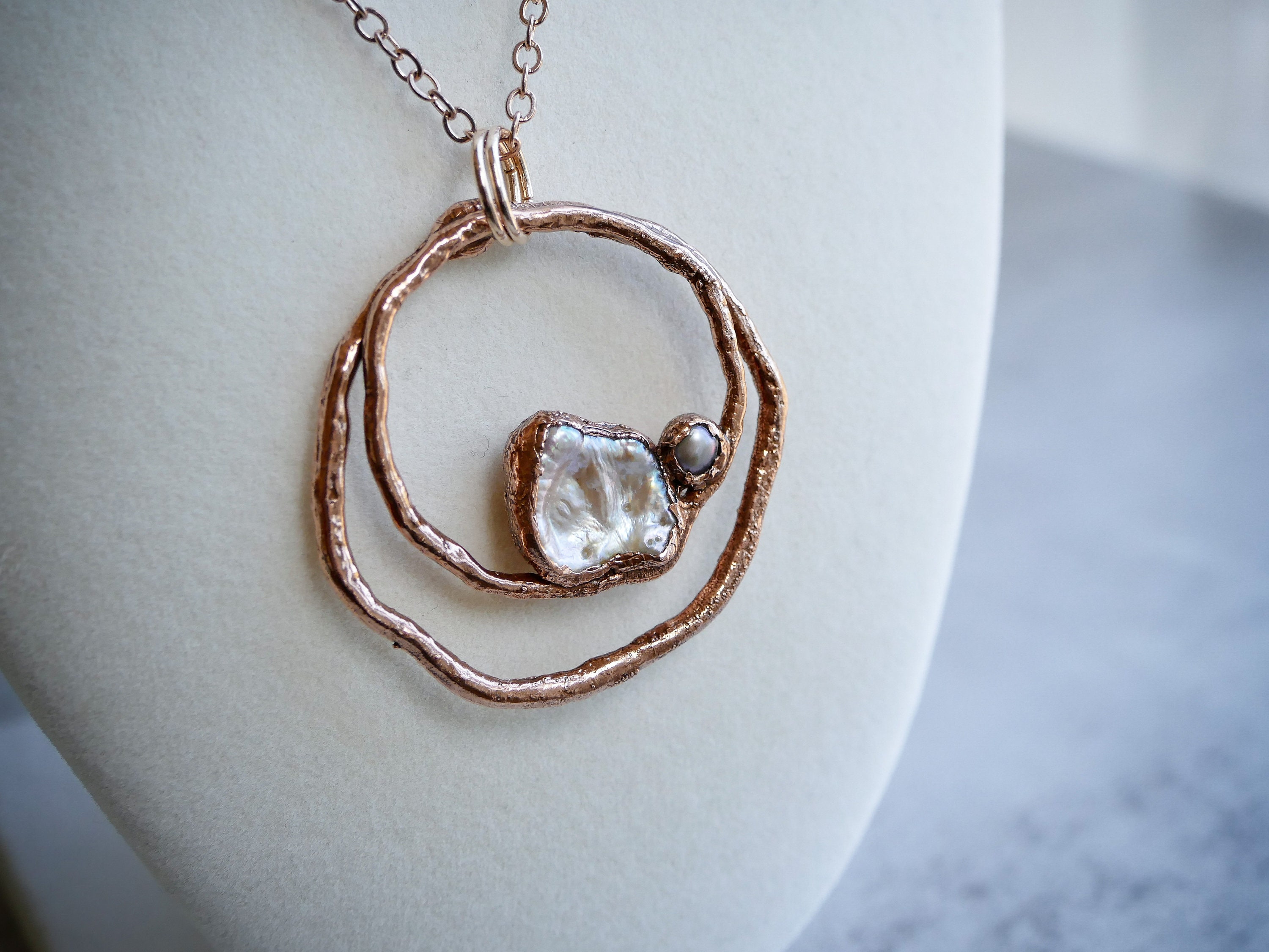 This handcrafted necklace features a Keshi Freshwater Pearl paired with a tiny pale pink freshwater Pearl. The pendant has been electroformed in copper & left in the shiny copper finish. The pendant has been sealed with an anti-tarnish protective coating.
