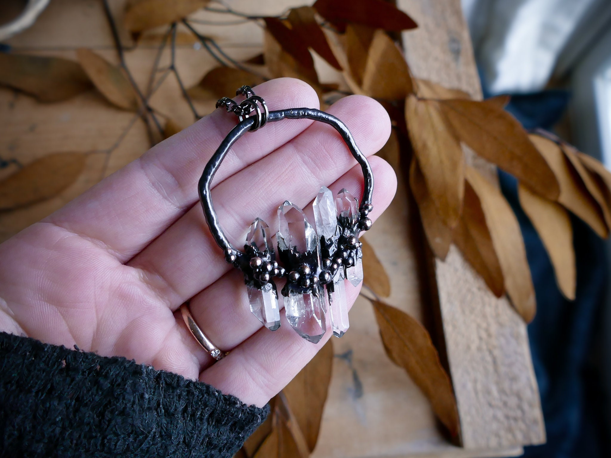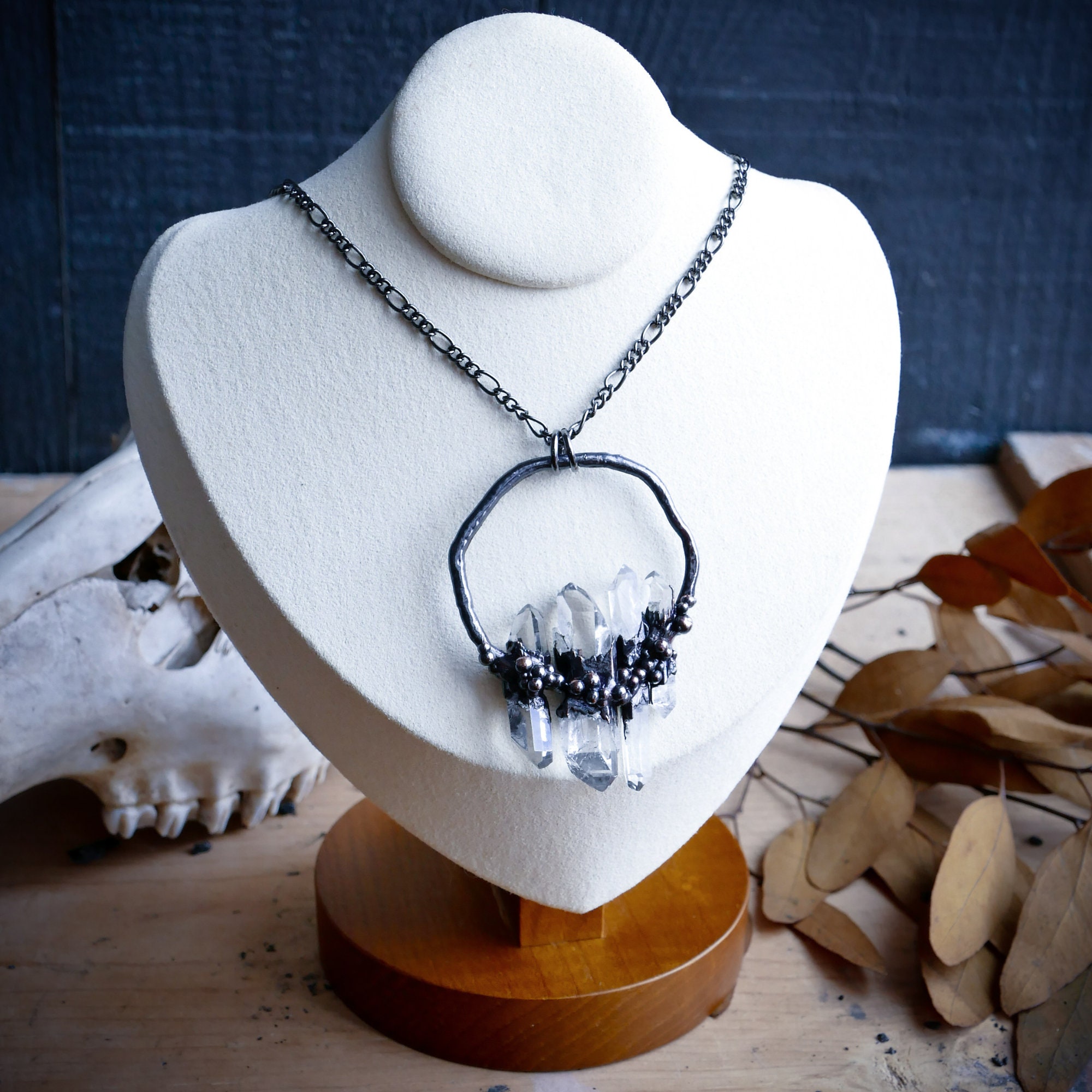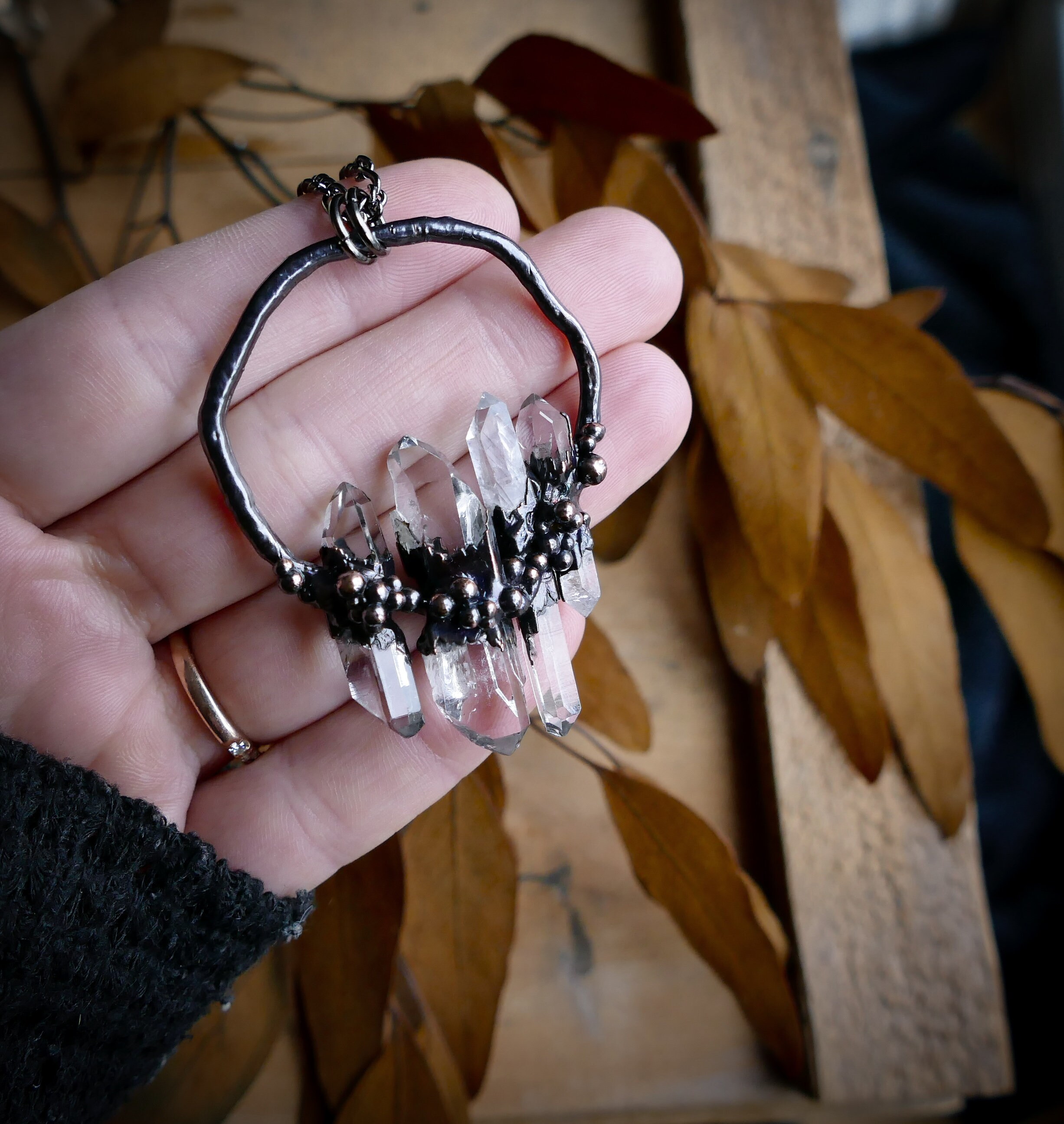 This handcrafted pendant features 8 natural Quartz stones electroformed in copper. The pendant has been given a dark copper finish and sealed with a protective coating.