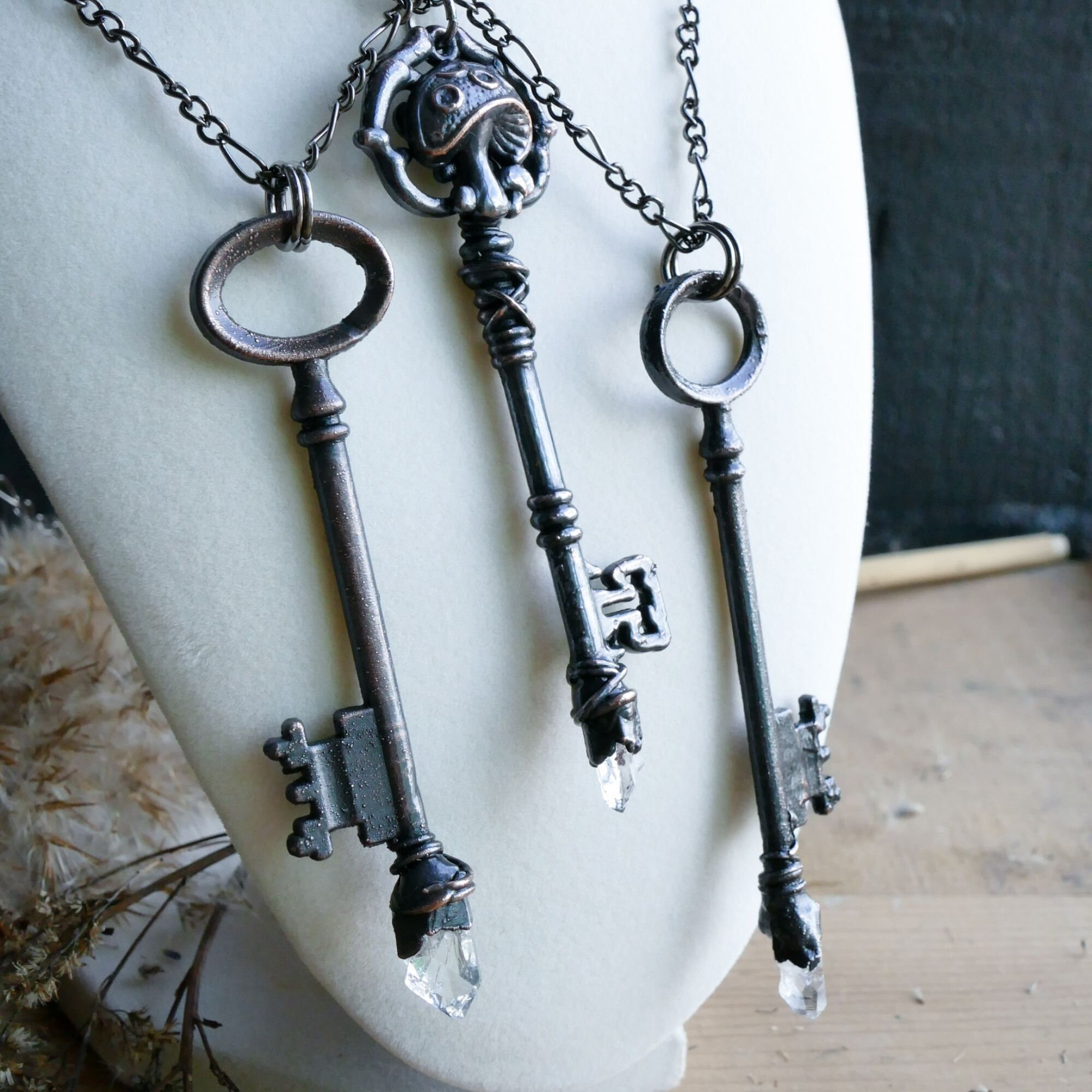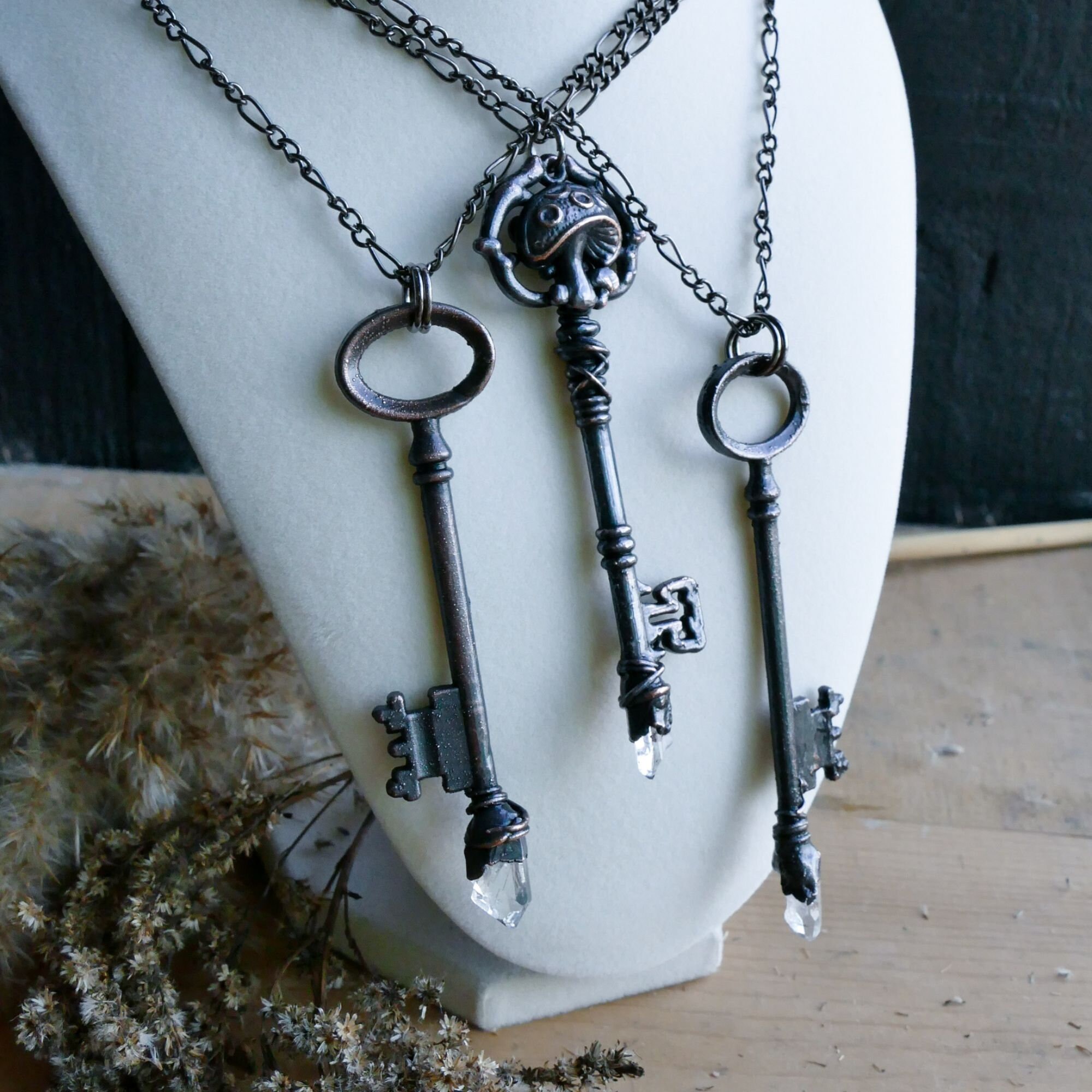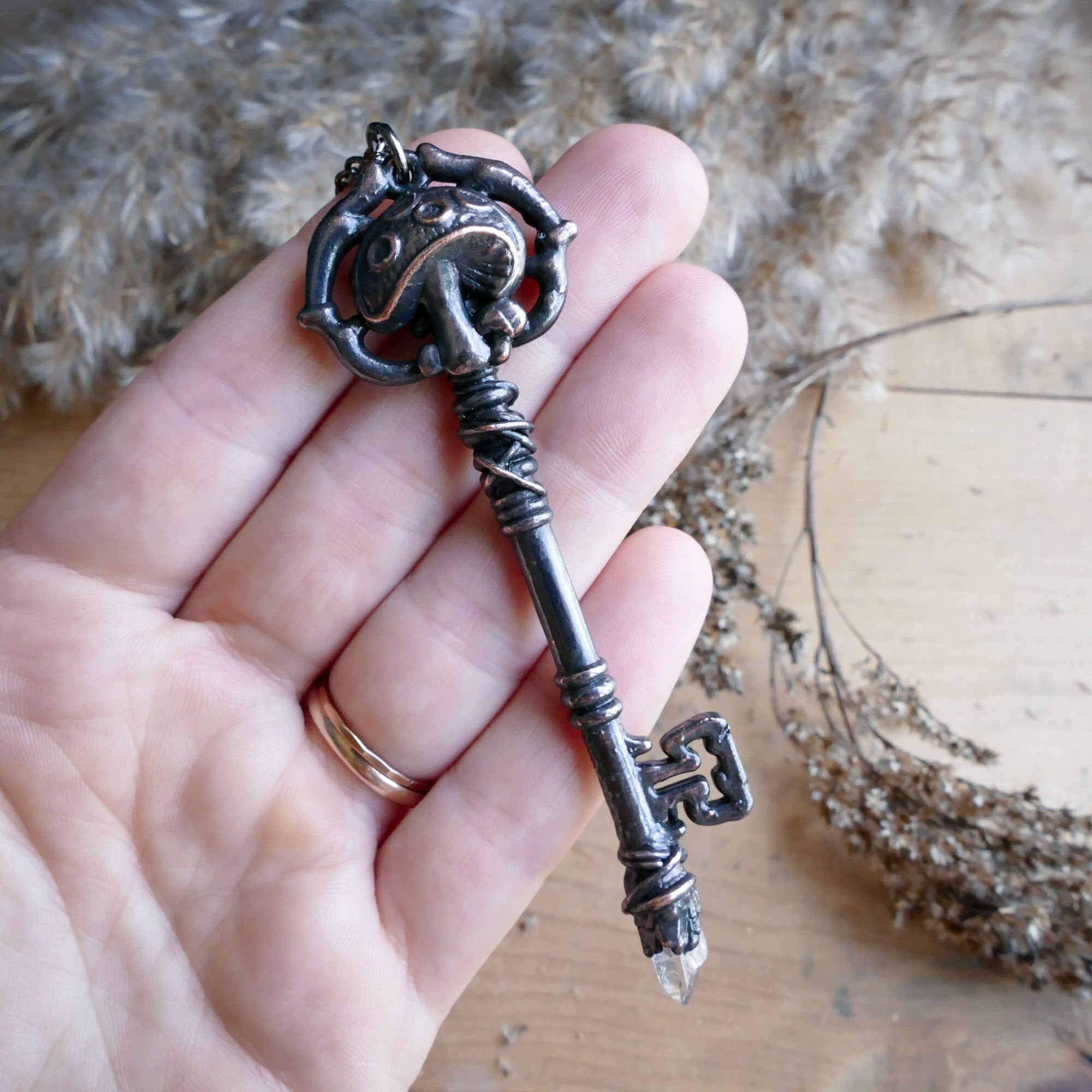 -The Large Mushroom Skeleton key is approximately 3 3/4 inches in length & adorned with a mushroom charm and a Quartz Crystal.