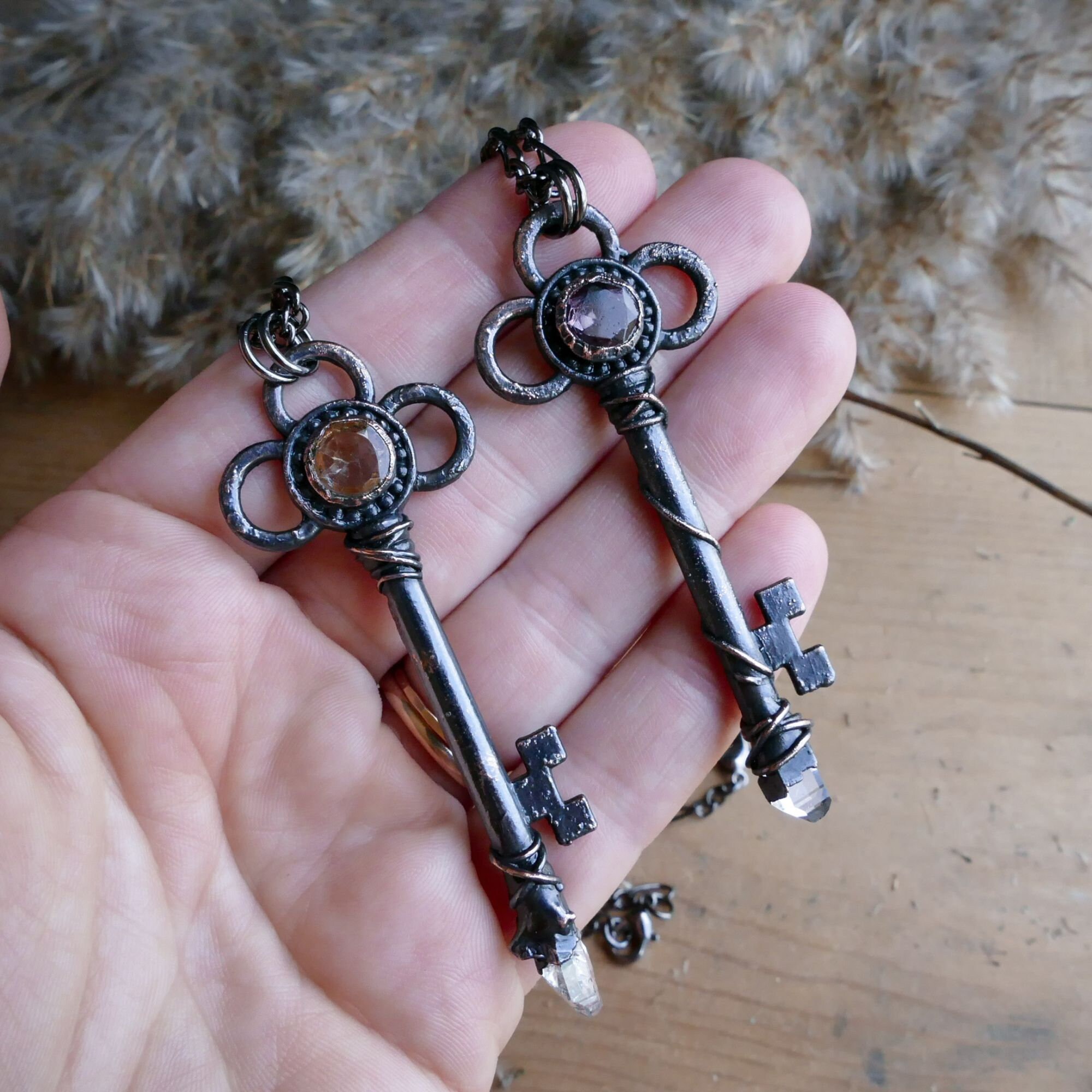 -The Smaller Skeleton Keys are approximately 2 3/4 inches in length. These smaller keys have been adorned with either a faceted Amythest or Topaz gemstone & adorned with a Quartz Crystal.