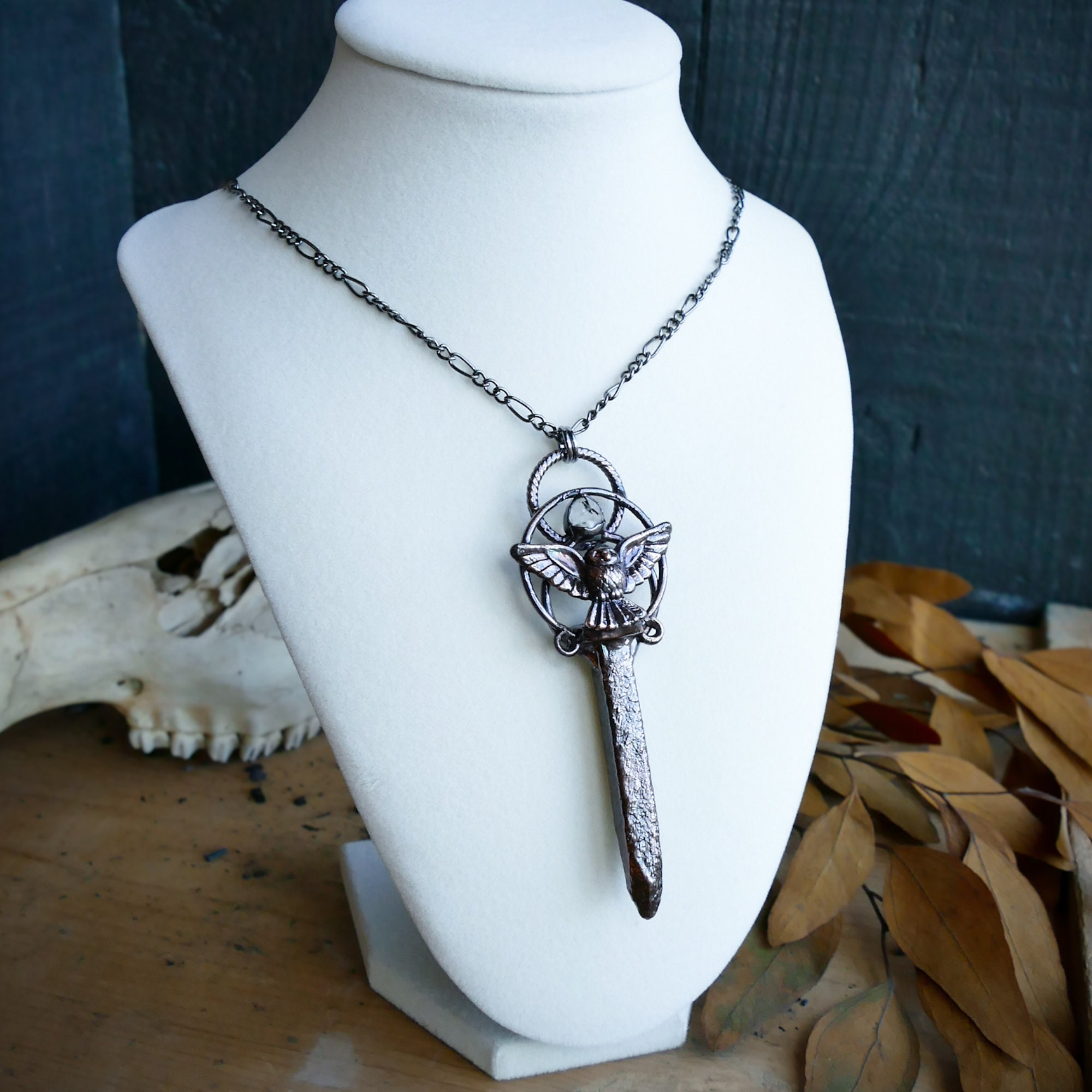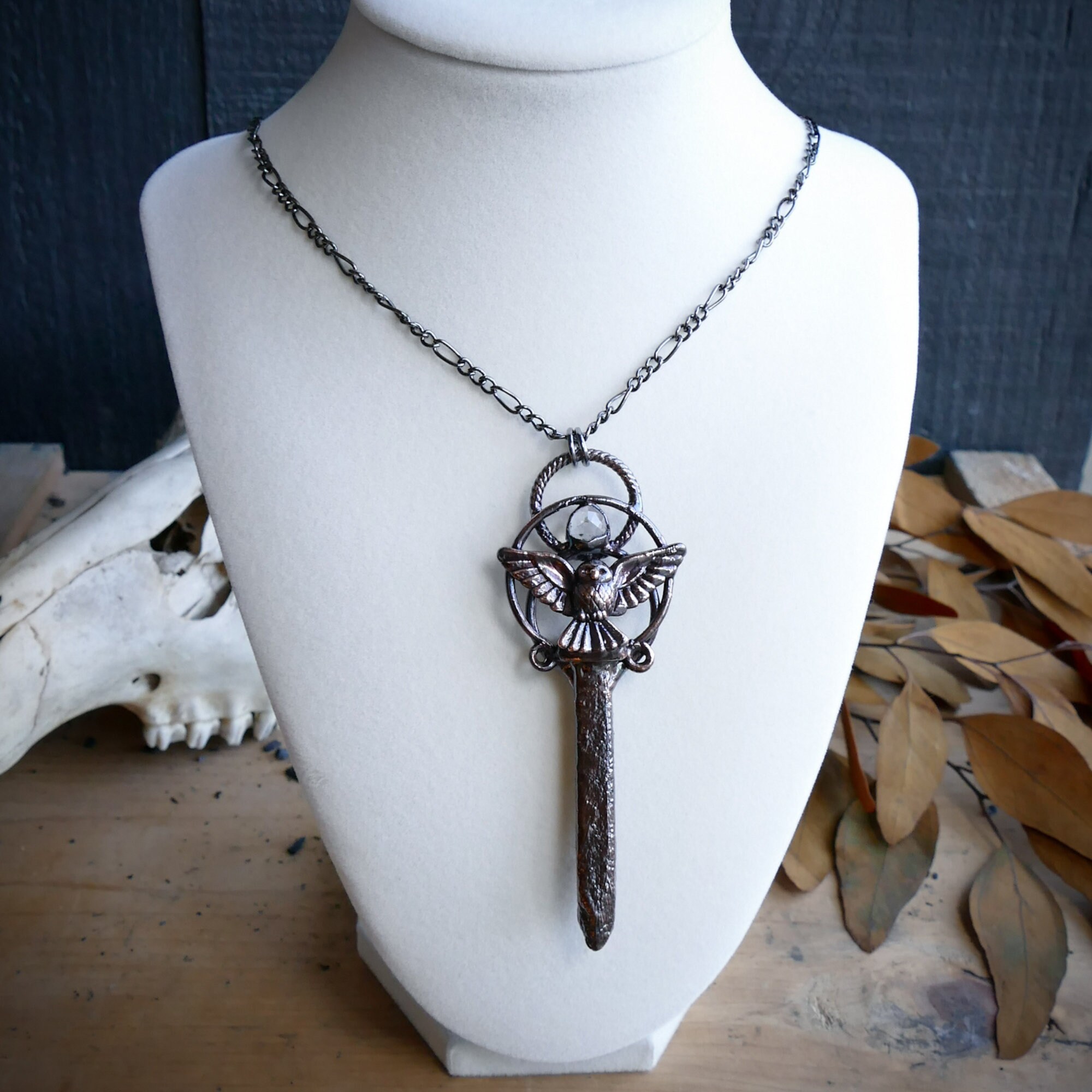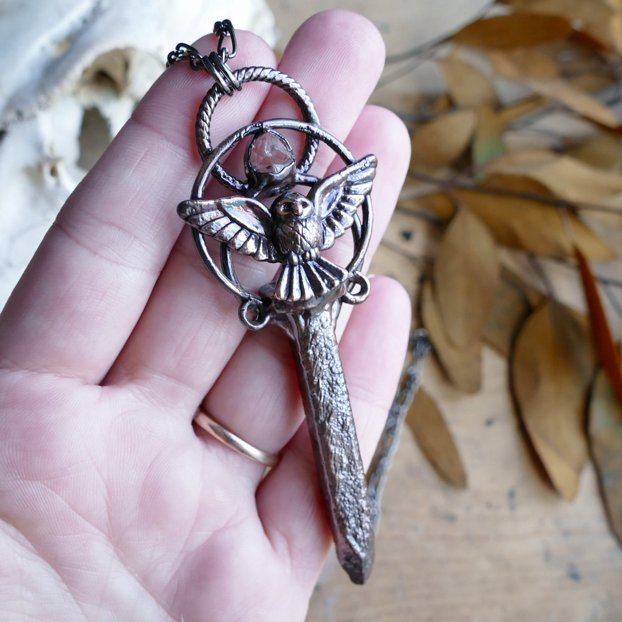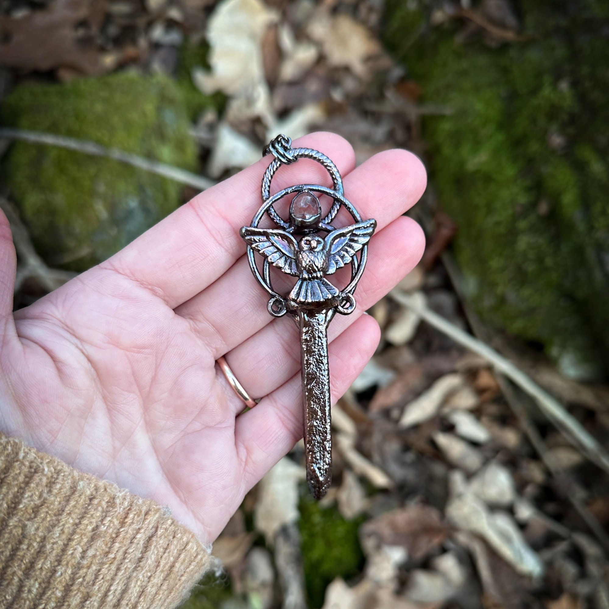 This magical handcrafted pendant features an antique railroad stake adorned with a Quartz Crystal and an owl charm. The antique railroad stake has a tiny number 31 inscribed on the top. This pendant has been electroformed in copper given a captivating dark copper finish. The pendant has been sealed with an anti-tarnish protective coating.