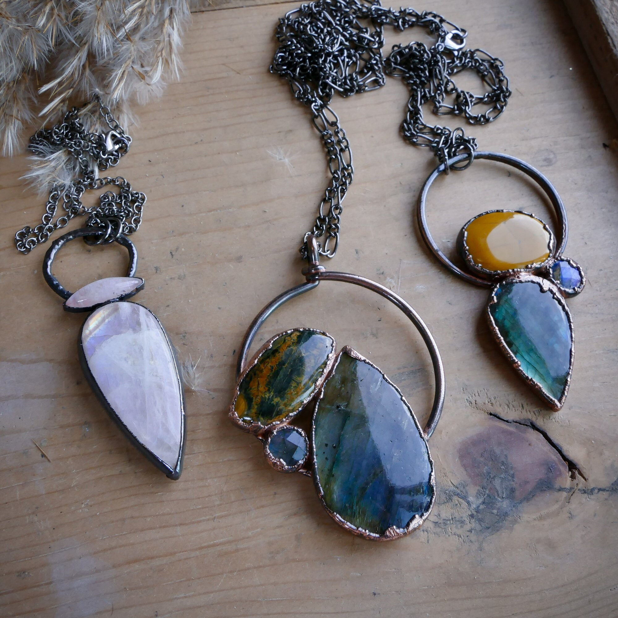 Electroforming is an intricate process of fusing copper onto another object using a low voltage charge. The copper can build up in certain areas creating unique texture throughout the piece. Each piece of jewelry is one of a kind.