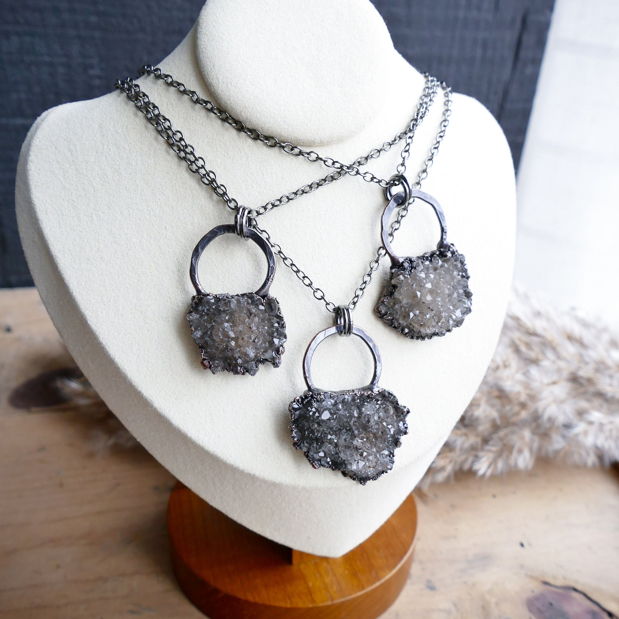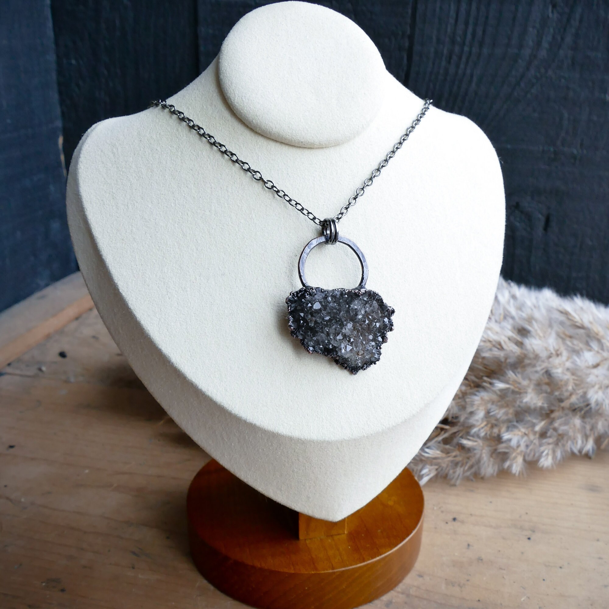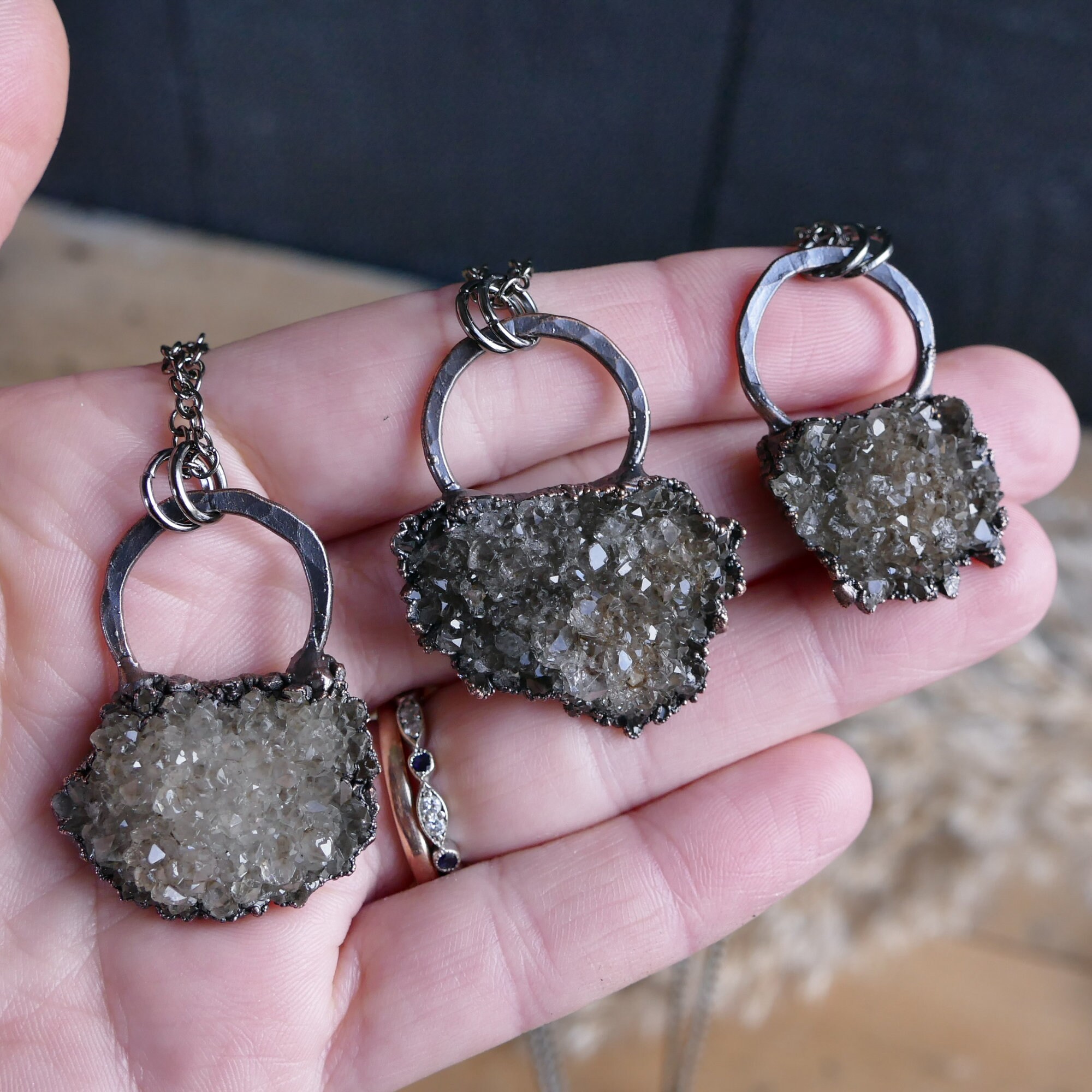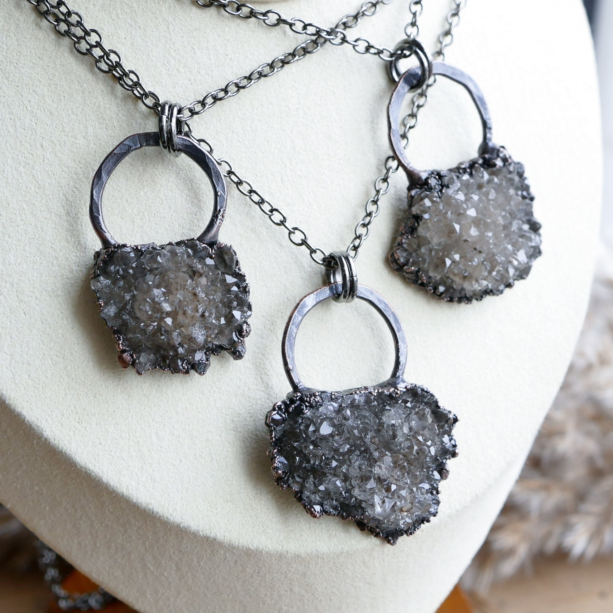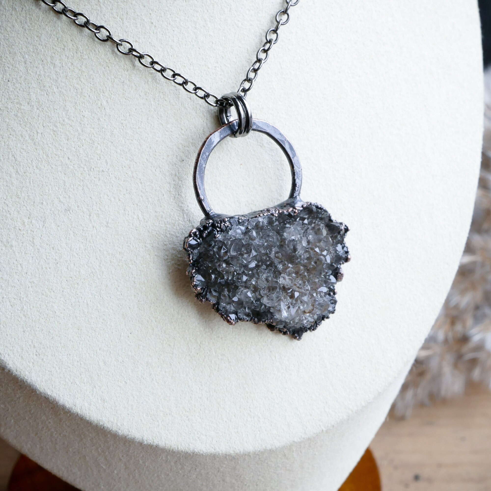 These handcrafted pendants each feature a natural Herkimer diamond Druzy cluster with a hammered copper bail. The pendants have been electroformed in copper given a dark copper finish. The pendants have been sealed with an anti-tarnish, protective coating.