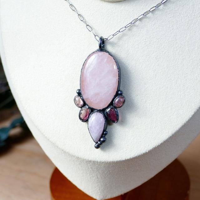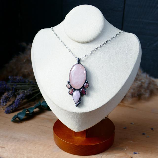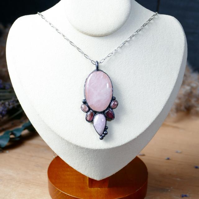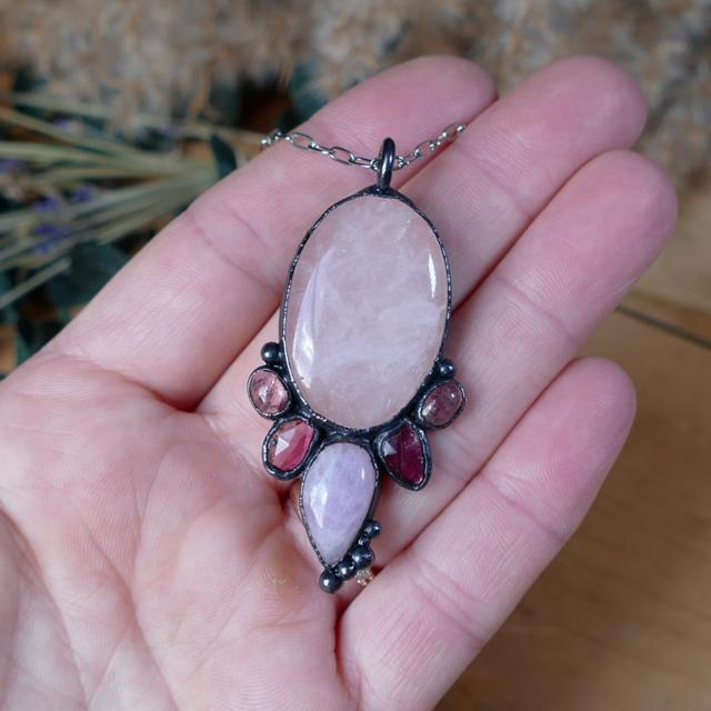 This handcrafted multi stone pendant features an oval Rose Quartz gemstone paired wiht 4 small berry pink Tourmaline gemstones and a teardrop Kunzite gemstone. The pendant has been electroformed in copper and given a dark copper finish. The pendant has been sealed with an anti-tarnish, protective coating.