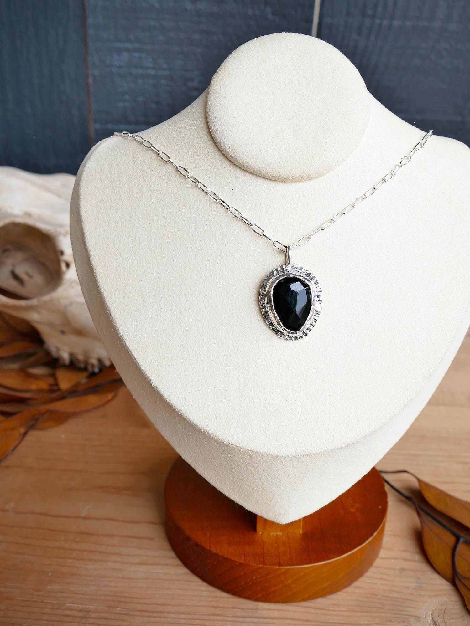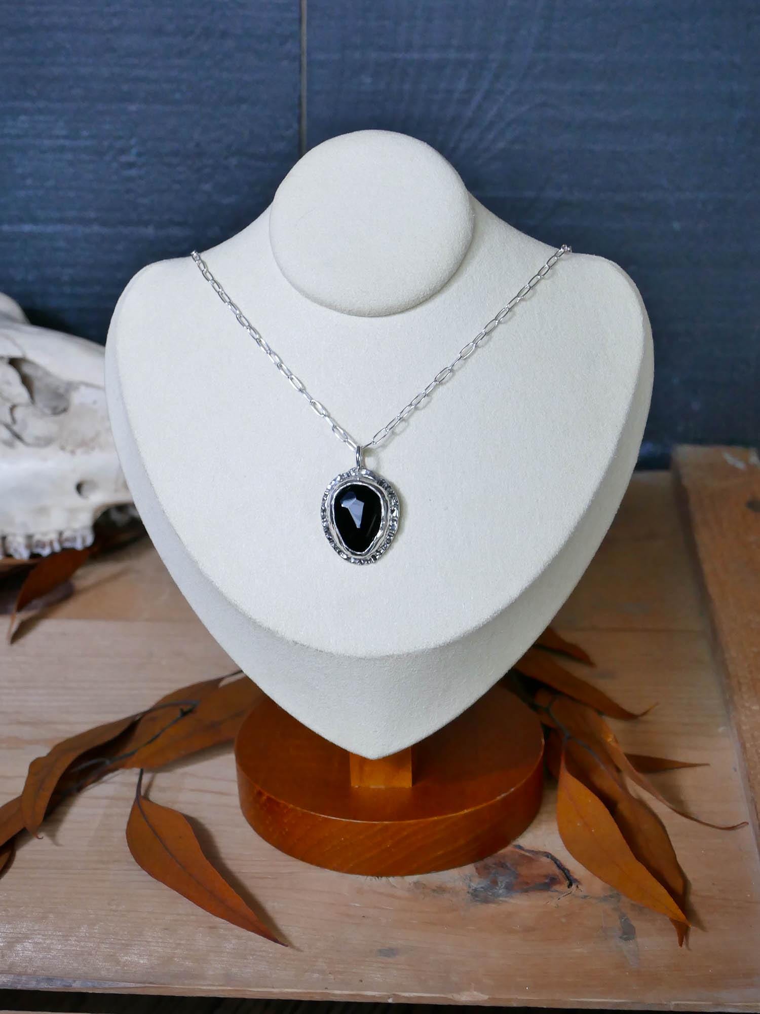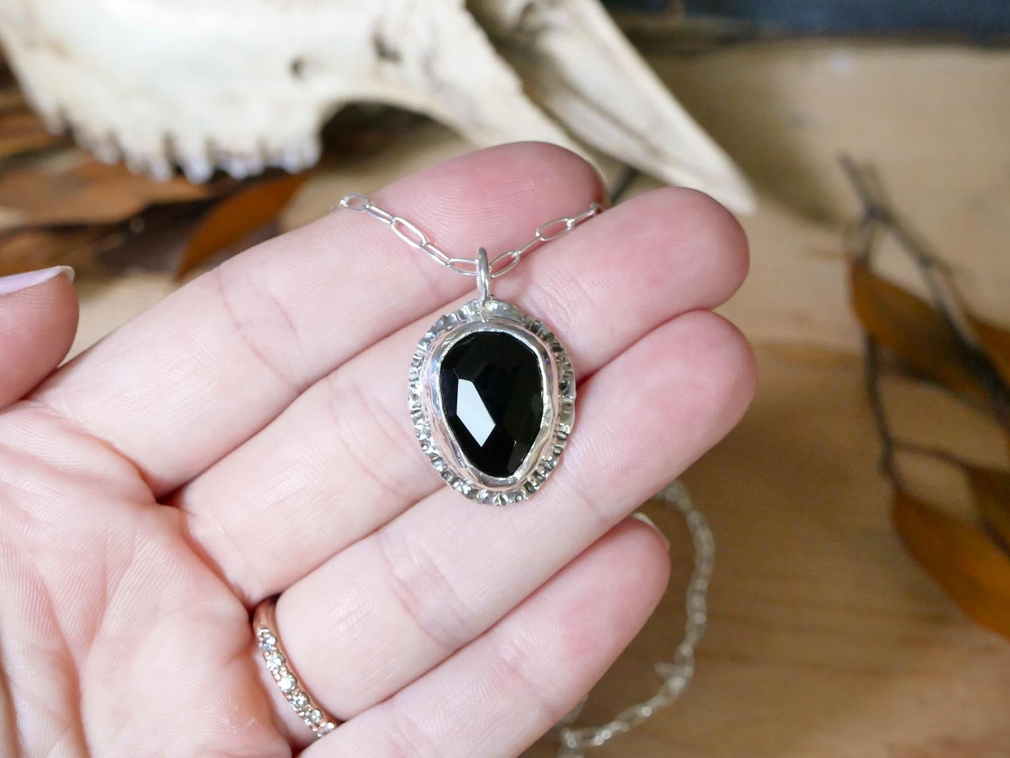 This handcrafted necklace features a stunning rose cut black Obsidian gemstone set in solid Sterling Silver. This necklace was crafted using the lost wax cast method.
