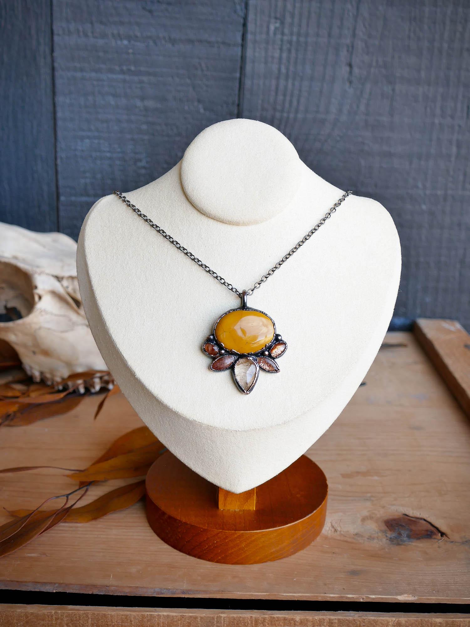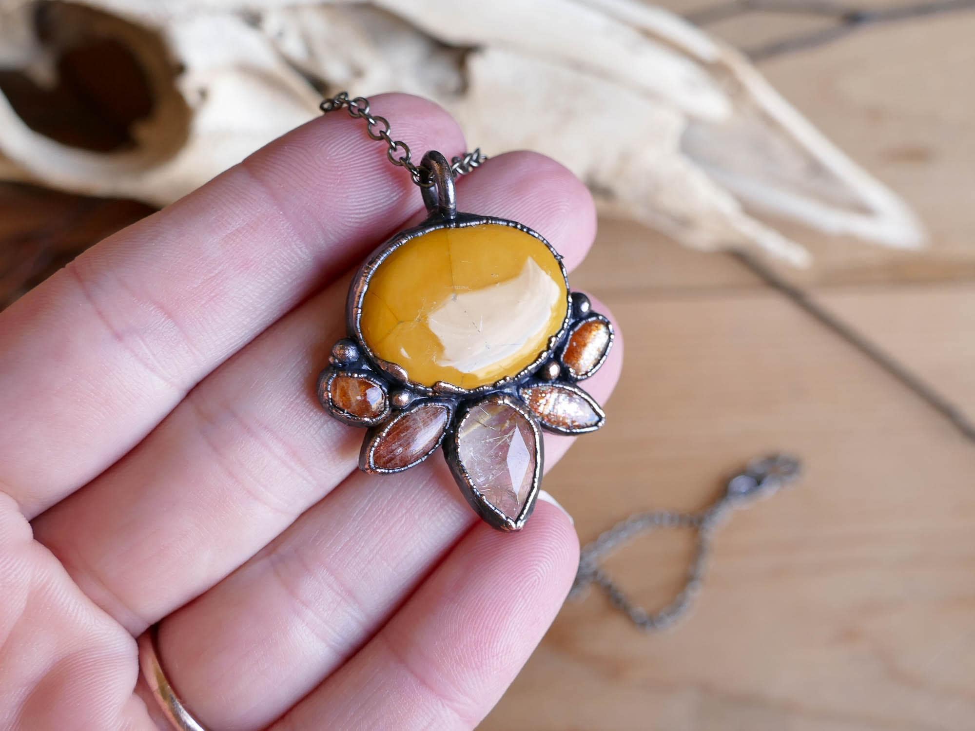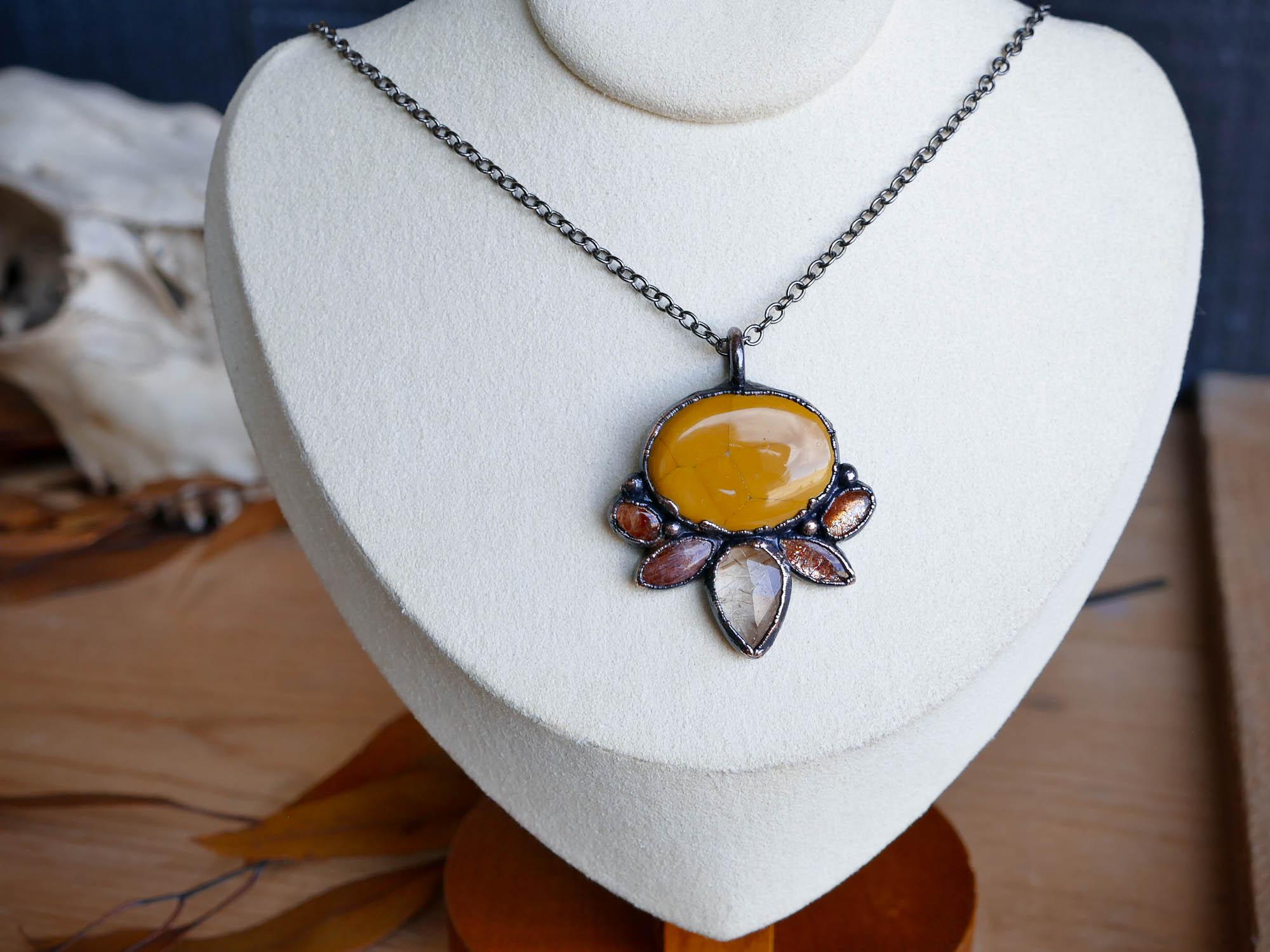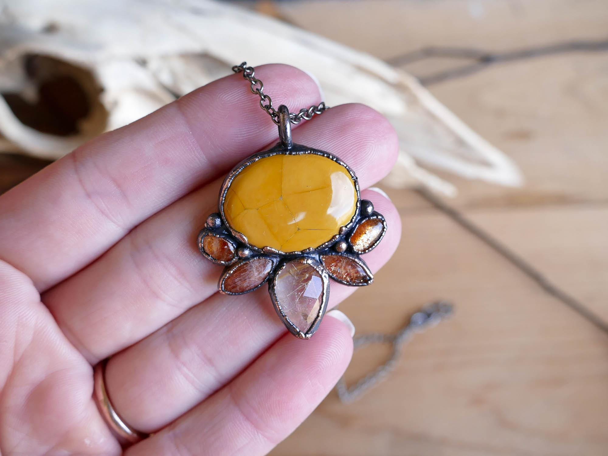 This handcrafted pendant features stunning yellow Jasper gemstone adorned with small Sunstone gemstone and a teardrop rose cut Golden Rutile Quartz crystal. This pendant has been electroformed in copper given a captivating dark copper finish. The pendant has been sealed with an anti-tarnish protective coating.